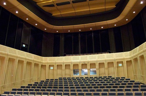 - Installation of carcasses millimetre perfect, each panel was on a fascet and sloping! Not an easy task given the size of the panels at the tallest point was 5 metres and also to marry up with the rising stage and door openings which had door facings cladded to be hidden within the acoustic panels.